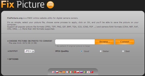 Fix Picture is a free online image converter service. There is no sign up required, upon opening the website you will be able to see the interface which you can see in the screenshot above. The unique feature provided by this service is that it supports more than 400 formats, so you can convert your images into any format you want. The output image stays in the server for 2 hours, after which it is deleted. It also has additional features like resizing, rotation and adding effects to your pictures. After that, you will get the link to share the converted image. It is very easy and feature rich image converter.