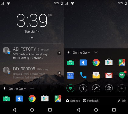 Next Lock Screen is the stock lock screen replacement app for Android developed by Microsoft as part of their Microsoft Garage Project. The Next Lock Screen adds app shortcuts to the lock screen automatically depending upon which of the apps you might require at a particular time of the day. There are 3 categories: At Home, On the go, and At Work. The lock screen app arranges the app on the basis of these factors. There are also quick toggles for Wi-Fi, Bluetooth, etc. apart from the apps. To launch the apps, you have to double-tap on the icon by default but you can change it to single tap if you want.