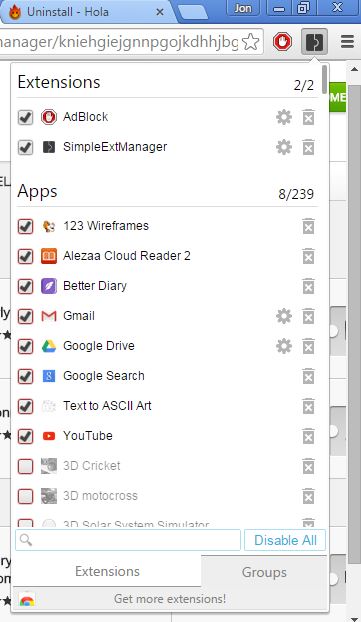 Access it easily from the top right corner of the screen. It lists first the extensions that you have installed, followed by apps and then themes. Extensions, apps and themes can be grouped and easily deleted by clicking on the trash can icon on the right. Extensions can also be disabled all at once by clicking on the “Disable All” button in the bottom right corner of the screen.