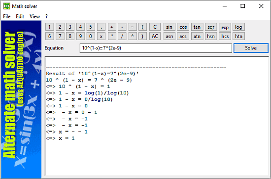 Math Solver is a linear and algebraic equation solver software where you can easily solve an exponential equation for the variable(s), say x. It gives you a complete solution of an equation. It can easily solve exponential equations of different degrees. At the top, it has the trigonometric functions along with numeric keys. You can use these functions in your equations or can use them separately to solve trigonometry problems.
