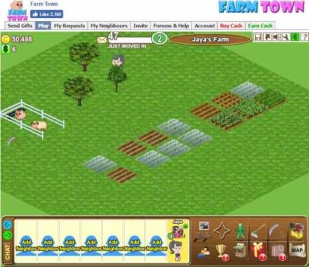Farm Town is a free farm game for Facebook. In this game you start with entering your name and creating a avatar for yourself. After that you will be taken to your farm where you have to plow the land and sow different crop seeds. These seeds can be bought at the store located in the bottom right corner. Buy the seeds and sow them in the plowed land. After a while when your crops are ready, you can harvest them, using the right tools. After harvesting you need to plow the land again and sow new seeds.