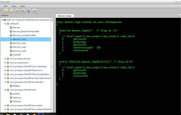 Nemo 440 is a flash decompile software for Windows which focuses on code. SwfModify focuses on media, whereas Nemo 440 can be used for decompiling and browsing code of a SWF file (ActionScript).