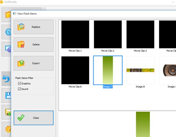 After loading the SWF you’ll see a player that plays the selected animation. First method of how you can decompile a flash file is by starting export of a particular frame. While the SWF is playing simply click on the “Modify (Current Frame)” option. Unfortunately this didn’t work for me. What did work is the “Modify (All Frames)” option, which decompiles the entire animation at once. SwfModify only decompiles media (graphics and audio), you can’t view the code. Only SWF files are supported.