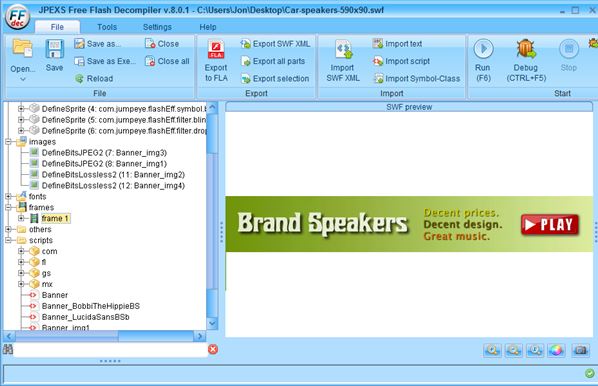 Next to SWFs, application also supports GFX, SWC and ZIP. After launching it, to load up a file click on the “Open” icon from the toolbar up top. After a scan (scan duration depends on the size of the file) detected images, videos, fonts, sprites, scripts and other included resources are going to be listed in the sidebar on the left. Decompiled resources can be exported one by one, or you can export them all at once. Other features include support for light editing, debugging and more.