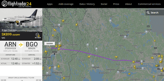 FlightRadar24 is yet another free website that you can use to track live air traffic. In the free version, this website times out after 30 minutes and then you will have to start a new session. Just like above websites, you can see the air traffic in real time and see the flight status of individual plane as well. You can see the air traffic at any point and look for a plane explicitly as well. You can track any plane by simply searching for it on the website. You can see the details like destination, departure time, arrival time, current coordinates, distance covered, and some others.