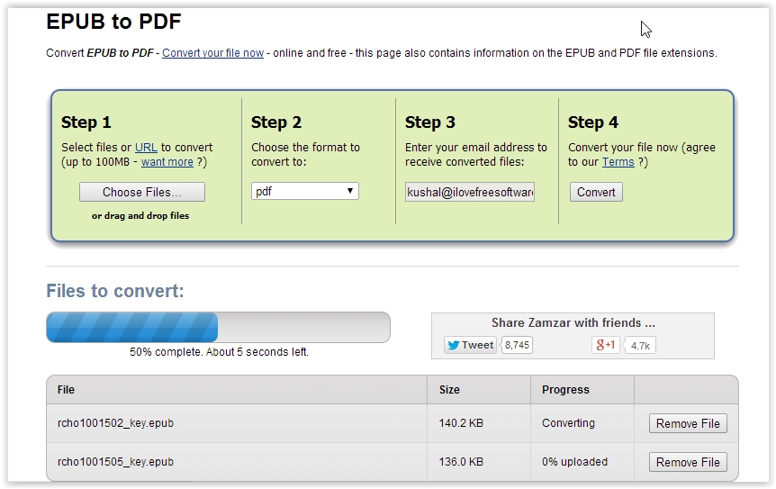 Zamzar is my next choice for free online ePub to PDF conversion. It is another easy to use website that does not require any kind of registration. You can simply convert your files in 4 easy steps. There are 4 different columns divided for this purpose. The first step, obviously, is to upload ePub files from your system to website. You can upload as many files as you want and can upload them in batches. The only thing to remember is that the maximum size of the file cannot be more than 100MB. Once done, you have to select the output format in the second step. The website supports a lot of formats, and PDF is one of them. In the third step, you have to mention your email address as the converted files are automatically sent to your email, from where you can download them. The fourth and final step is to hit the convert button.