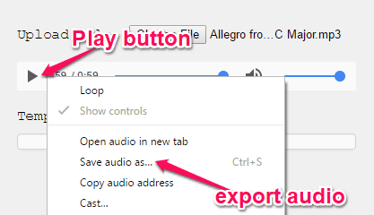Step 3: After you’re done changing the tempo, you can go ahead and click the “Play” button to listen to the changed audio. Apart from that, you can also export the audio file as an MP3 file to your PC. To export, simply right-click on the “Play” button and then select the “Save Audio As” option.