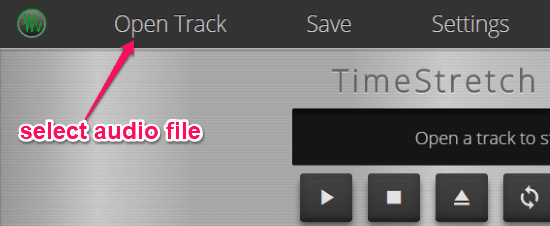 Step 1: First, visit the TimeStretch homepage and you will see a button named, “Open Track” at the top. Simply click on this button to select an audio file from PC or you can also drag and drop a file on this online tempo changer.