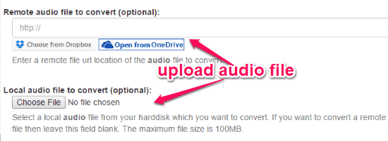 Step 1: When you browse “Audio Speed and Pitch”, you will be able to upload an audio file from your PC, OneDrive, Dropbox, or you can simply enter an URL of an audio file.