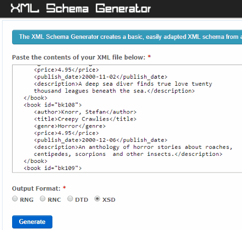 You need to paste the XML file data into its interface and then select any of the available output formats. You can also edit the input data before that. Once you have done that, press Generate button. Finally, you can preview the output data and then download it to PC as XSD file.
