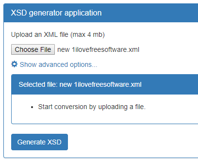 If you are looking for a website that lets you upload more than 2 MB XML file for XSD conversion, then you should give a try to XML to XSD Generator. Here is its homepage. It lets you upload maximum 4 MB XML file for conversion, which is better than other websites.