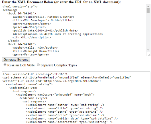 Xmlforasp.net comes with a very simple XML to XSD converter feature. But the features provided by this website are quite useful. You can add XML data and then select the XML Schema design type: Russian Doll or Separate Complex Types. After that, you can generate the output XML Schema. Before generating the output, you can also edit the input data. The feature to edit output XSD data is also available. When the final output is ready, you can copy XML Schema to the clipboard and then manually save it as XSD file.
