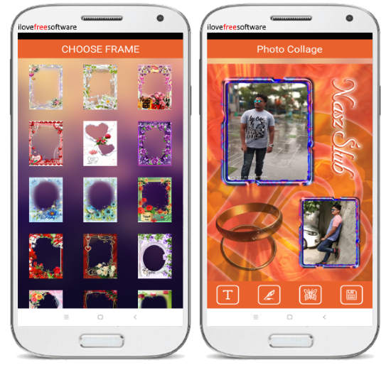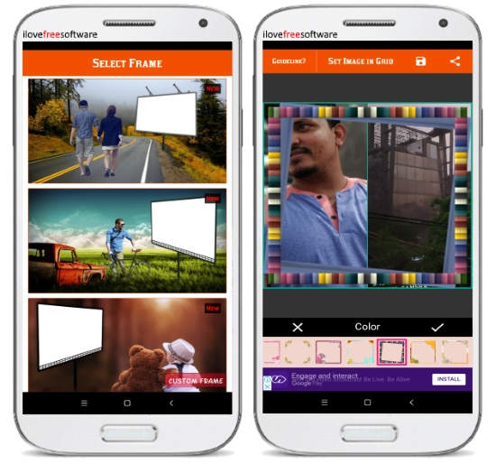 Photo Frames (by Studioapps) can also be used to create beautiful frame photos on Android for free. This app also offers dozens of collage frames which you can use and add your photo to them. In addition to that, it provides many photo hoarding frame like you can add your photo to a blank hoarding which is being checked out by people, roadside hoarding, and so on. This app is very simple to use, as all you gotta do is open it and choose a photo hoarding frame or collage frame. After that, you can choose photos from gallery and add to the frame. It also lets you add custom text, add shapes, etc. Once done, you can save the framed photo with ease.