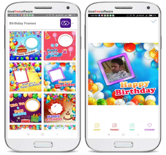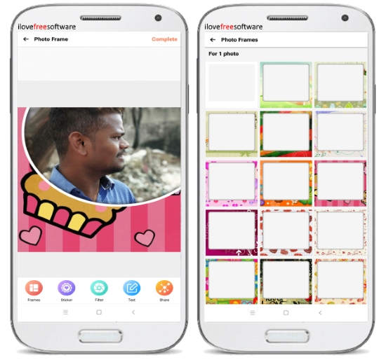 Photo Frames (by Tri Core) is also a free photo frame Android app which you can use to create stunning photos by adding various frames to them. This app exhibits dozens of photos frames in different categories including Flower, Birthday, Love, and Good Morning. So, this app is ideal for those who want to share a framed photo wishing someone a birthday, or to express love, etc. Using this app is quite easy, as you can simply open this app, select a frame from any of the categories, and then insert your photos with ease. Then you can easily share or save the photo frame to the gallery. This app also comes with the option to add custom text and various stickers to the framed photo.