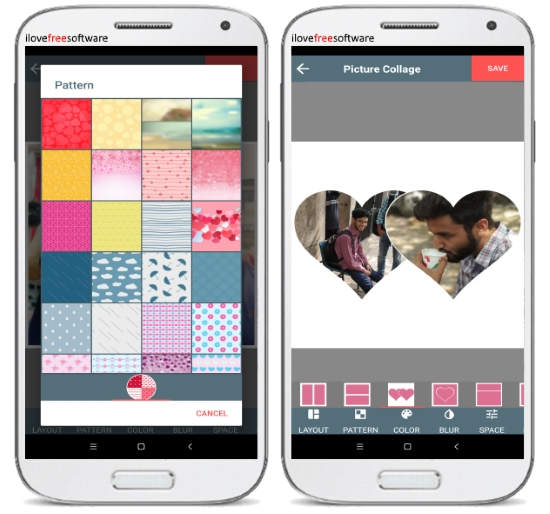 Photo Frame Collage is another useful photo frame app for Android that offers more than 200 frames for you to use. The frames offered by this app are divided into two styles called “Collage” and “Scrapbook”. After opening this app, choose any frame style you want and the associated frame. As soon as you do that, it will ask you to select the photos for adding to the frame. You can choose multiple photos for a single frame. After you have added the photos, you can export the photo frame to phone storage and also share via social networks. This app also comes with various editing options like change frame pattern/color, blur, adjust frame size, add icon, text, and do more.