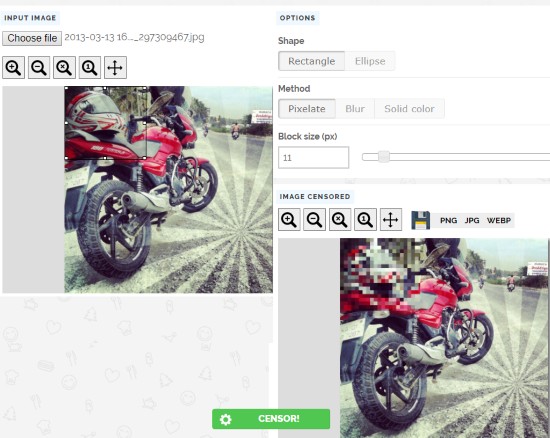 Censor Photo (Blur, Pixelate) Online by Pine Tools lets you pixelate selected area on a photo. You can either pixelate a rectangular area or an elliptical area. Here also, you can set pixel block size. After uploading photo, set the shape of area to pixelate, then select the area. Now, click on Pixelate button and then set Pixel block size. Hit the Censor option to apply the pixels on photo. You can save the processed image as PNG, JPG, or WEBP photo.