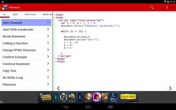 This is another reference app, with lots of good examples of code. Image above shows code sample for setting up the Fibonacci counter in Javascript. There’s hundreds of other similar info snippets that will help you hone your programming skills.