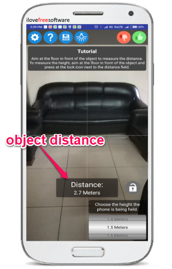 Smart Measure is also one of the best free distance measurement apps for Android. It allows you to easily find out the distance of any object you want just by pointing the phone’s camera to it. To use this app, simply open it and then set the phone’s height from the ground by tapping on the “Height” option visible on the left. After that, simply stand up and hold the phone to the height you have entered. Now, you can point the camera to the bottom of the object whose distance you want to find. As soon as you do that, this app will automatically calculate and show the distance on the camera screen in real-time.