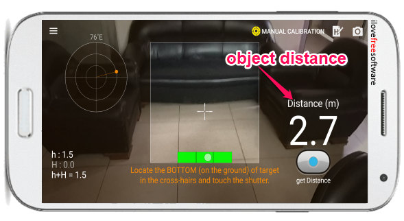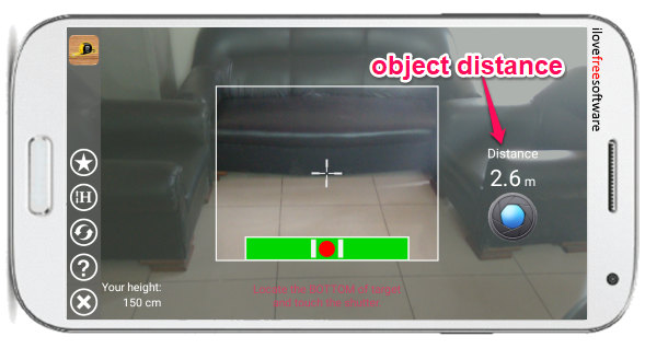 EasyMeasure is another simple distance measurement app for Android which you can use to find out the distance between any object and you. It allows you to use your Android camera to do the same. When you open the app, you can see the app’s camera and a slider on the left which you can use to set the height of the phone. As soon as you do that, you can simply point the camera to the object and keep the arrow-hair at the bottom. After that, it will automatically calculate the object’s distance and show it to you instantly in real-time. It shows the distance in centimeters.