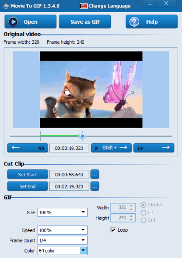 Movie To GIF (Homepage) is another great MKV to GIF converter software. It can convert only one MKV file to GIF, but the features are simply awesome. The feature that I like the most is you can cut video to desired start and end points and then generate GIF for those points only. Thus, if you have a long video and you need only specific part as animated GIF, then this software will be a perfect choice to try. Moreover, the video preview option is there to help you check if start and end points are same as expected.