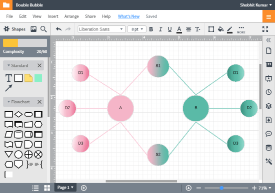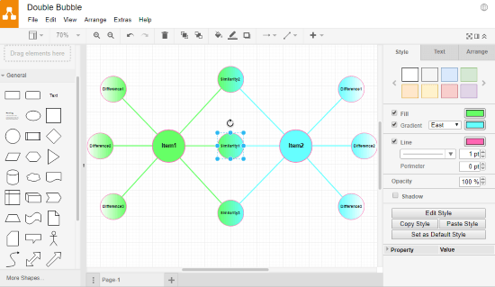 The process of making double bubble maps is simple and straightforward here. Like all the other editors on this list, LucidChart also has a shape toolbar from where you can drag & drop shapes to the canvas. After adding shapes, you can add text inside and customize the visual appearance of the shape. You can copy-paste a shape or add new shapes from the toolbar to complete the bubble map. From the other toolbar at the top of the canvas, you can fill a selected shape with a color, change opacity, and add a gradient effect. Similarly, you can customize the text format and change its size and color.