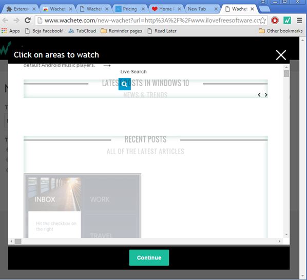 Wachete is another web based page monitoring extension for Chrome that offers partial web page, full web page or full web page plus sub pages monitoring. Important thing to keep in mind that free accounts are limited to 10 pages and 1 hour minimum in between checks.