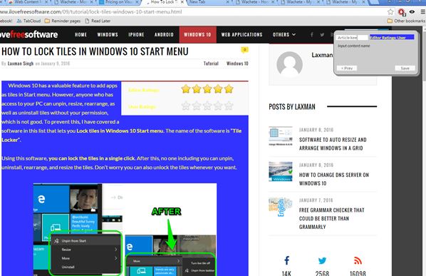 This is good, but also somewhat limiting. Web Content Monitor for example doesn’t support full page monitoring. Only sections of a web page (content within specific boxes) can be monitored. On the image above I’m selecting the article box for monitoring and inclusion to the watchlist. Time in between checks and notification alarms can be tweaked and setup.
