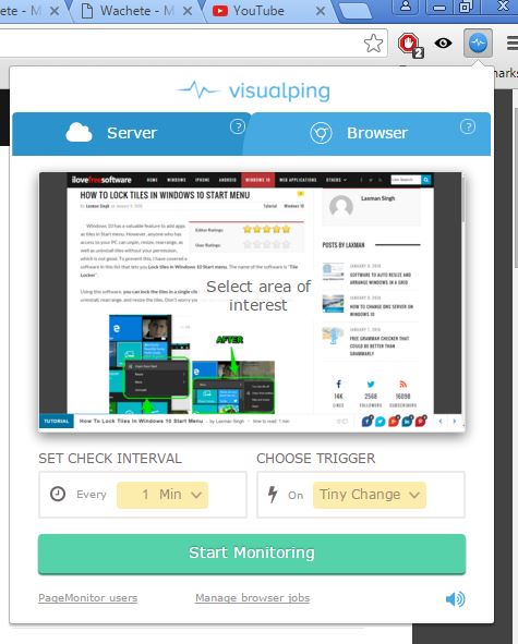 Visualping is one of the most advanced page monitoring extensions that I tested. It offers both web based monitoring (requires account, free accounts limited to 2 checks per day) or local, using Chrome (Chrome needs to be open for the monitoring to work).