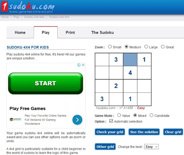 1Sudoku is a good website where you will find 4×4 Sudoku puzzle games. You can play this 4×4 Sudoku game online and you can print the puzzles as well. You can see the home page of the 4×4 Sudoku puzzles in the screenshot above. On this page you can play this game online. You can start by choosing the grid size from small, medium, large, and great. The difficulty level of the game can be changed from the bottom of the page. There is a drop down menu from where you can select difficulty level between easy and hard. You will also find a button to see the solution of the puzzle.