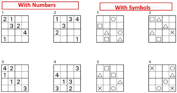 When you click on the puzzle image, it will open in printable format. You can also download this Sudoku puzzle and print later. The print command will print the Sudoku puzzle. There will be two pages that will be printed, one is the puzzle page and the other is the solutions page. There will be four puzzles on one page. You can give the puzzles to kids and try teaching them Sudoku with numbers, symbols, or letters.