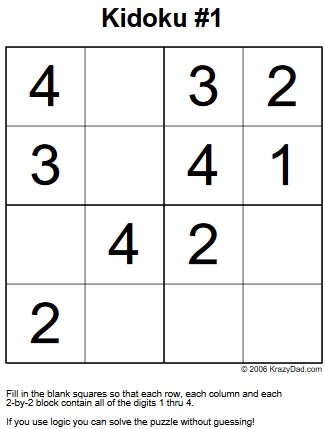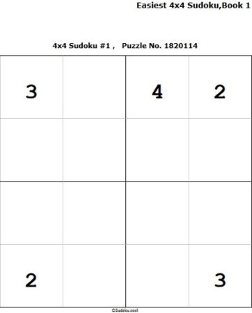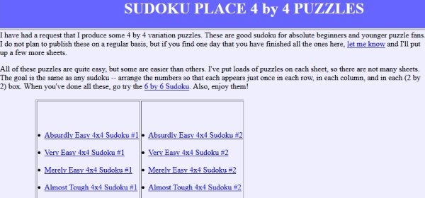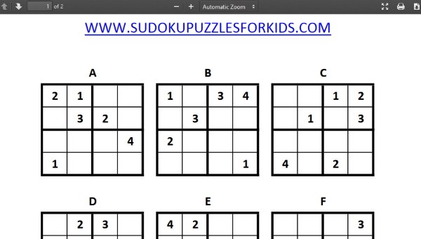 Krazy Dad is a fun website, where you will find a lot of 4×4 Sudoku puzzles to print. The puzzles on this website are given in book format. Each book has around 8 pages. The last page of the book contains all the solutions to the puzzles. These books are arranged in order of increasing difficulty. So the initial books are all easy versions and then keep on getting more challenging.