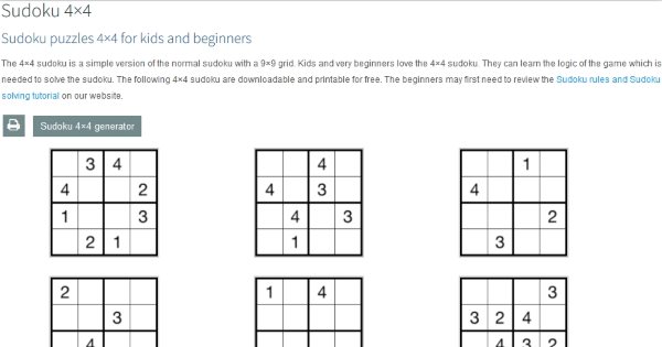 These are some free and useful websites which you can use to print 4×4 Sudoku sheets. These can be quiet beneficial for kids. If you are teaching your kids about Sudoku puzzles, then this level is the easiest to start with. The 4×4 grid of Sudoku is a good way to make kids learn this game. So try out these websites.