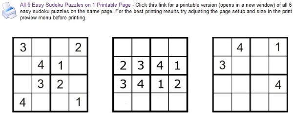 There are about 5-6 puzzles for 4×4 Sudoku. They can all be printed on one page by clicking the link next to the printer icon. You can download it to computer and then print later or can give the print command directly.