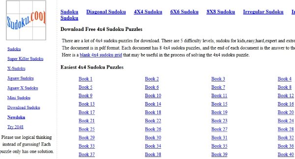 Sudoku.Cool has lots of 4×4 Sudoku printable puzzles. As you can see in the screenshot above, there are two categories of the 4×4 Sudoku puzzles. They are easiest and easy. Each of them have 40 books of puzzles each. Now, each puzzle book has 8 Sudoku puzzles and solutions to them. So you can calculate that there are a lot of puzzles for you to try.