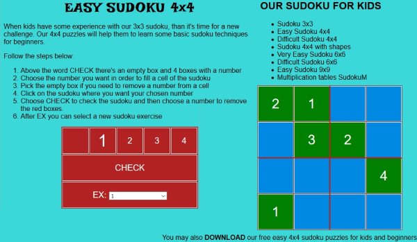 Sudoku Puzzles for Kids is a nice website to find 4×4 Sudoku Puzzles. The home page of the website can be seen in the screenshot above. The website offers some 4×4 Sudoku categories like easy, difficult, and Sudoku 4×4 with shapes. You can start with any one of these. When you click on a category, you will be shown steps to follow on the left side of the screen. At the bottom there would be a download option. Click on it and the downloadable version of the puzzle will come in front of you.