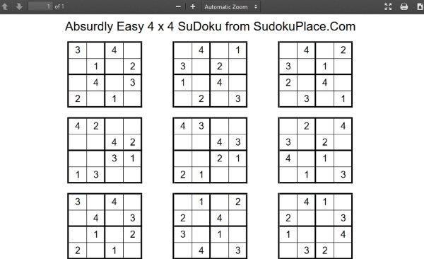 Sudoku Place offers you 4×4 Sudoku puzzles with various difficulty levels. You can see in the screenshot above there are various difficulty levels for these puzzles. Difficulty levels such as absurdly easy, very easy, merely easy, and almost tough are some levels which you can play. When you click on a level it will open up in printable format.