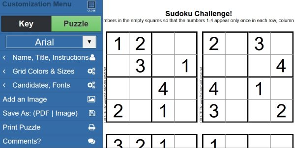 The Teachers Corner has some good 4×4 Sudoku puzzles. On the website you will see an interface like the one shown in the screenshot above. Go to the print Sudoku tab at the top. Now select 4×4 grid. You will be shown some sample 4×4 puzzles, below that you have options to change the font of the puzzle. Once done, click on the generate Sudoku printout button. This will generate a sheet like shown in the below screenshot.
