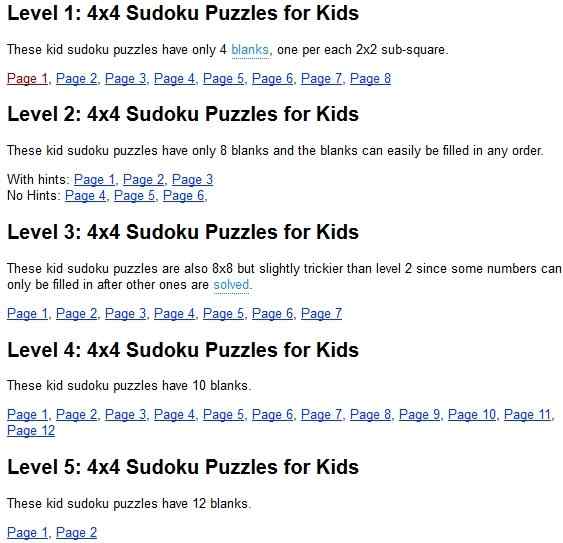 Print Activities has lots of printable Sudoku puzzles. You will notice 5 levels of 4×4 Sudoku puzzles, as can be seen in the screenshot above. You can start with any level. Each page will have 2 Sudoku puzzles on it.