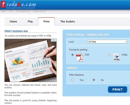 If you want to print these 4×4 Sudoku puzzles, then go to the print tab from the top of the page. The printable page will look like the screenshot above. You can choose the difficulty level from easy and hard. Then choose what format you want it to be printed in from PDF and HTML. You will also have the option to print the puzzles along with solutions. Just check the appropriate box. When you print there will be 16 4×4 Sudoku puzzles printed on one page. So you will have lots of puzzles to solve. Once you have chosen all the options click the print button. Now you can try out all the printed Sudoku puzzles with your kids. Young children who are learning this puzzle game can benefit from this.