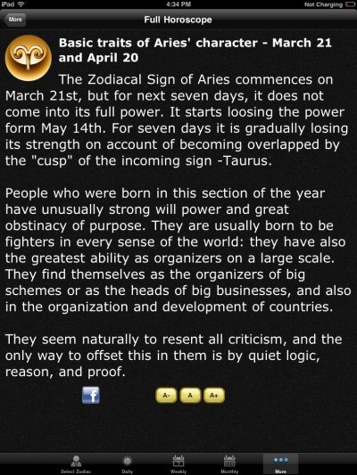 One of the interesting feature of this iPad horoscope app is that you can see basic traits of any zodiac sign. To do so, just click on “More” button when you are seeing horoscope of that zodiac.