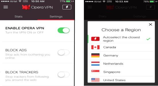 The first VPN app in my list is the Opera VPN. It is definitely one of the best VPN app for iPhone. This app allows you to connect to servers of 5 different locations like the United States, Canada, Singapore, Germany, and Netherlands. Doing so, you can browse region-based restricted websites, protect your privacy, network connection, and other online data. For this, all you have to do is select a location and enable the VPN button, that’s all.