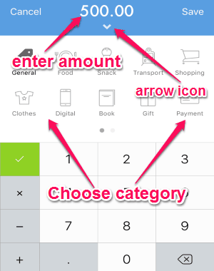 After you open up the app, click the “+” button at the center to add new expenses. A new screen will appear with a number keyboard along with different categories. Choose a category and enter the expense amount and then tap the save button. Below the bar where you can enter an amount, there will an arrow icon. Click the arrow icon to change expense date and also add a note. The following screenshot shows how to add expenses.