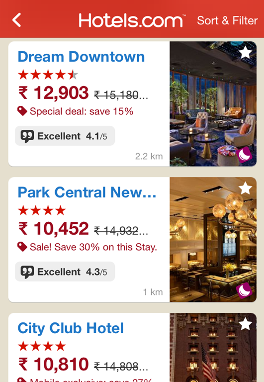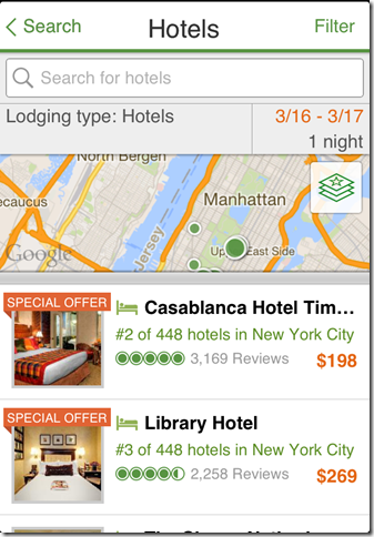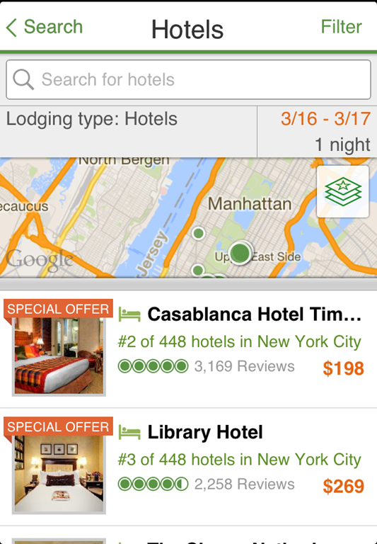The next app is Expedia Hotels & Flights. This is one of the easy to use app for finding hotels. You have to just enter the name of the location in which you want to book the hotel. The app displays the hotels available at the location specified by you. You can then narrow the search results by specifying your criteria in the Filters. The best thing about the app is that you can also search and book the flights from it. So in case, you are thinking of going on a trip then you don’t need to have two apps. This one will just work fine for you.