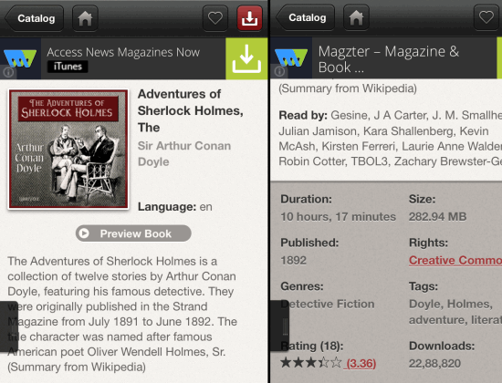 This free audiobooks app also provides you with a preview of each audiobook, before you can start downloading it for reading the complete book. You can also mark the books you like as Favorite. Apart from this, when you have downloaded the books, you can sort them on the basis of author, title, and recent.