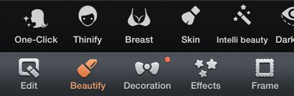 The second option in this menu is Beautify. Here you can fix red eyes and blemishes in your face. The best part is the one click option which will give your face a makeover in one click. Apart from this option you also get option to apply make up, make eyes large, change sking tone, etc. There is a option called thinify, which will make your face look thinner then it is. All you have to do is follow the instructions given by the app. The intelli beauty option also helps your further refine the thinify and large eyes features.