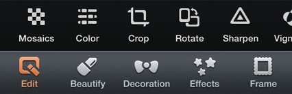 Edit: This button will take you to the photo editing screen, where you will be asked to choose a photo from your photo gallery to edit. Here you can edit, crop, rotate, sharpen your photos. Also you can change the brightness, contrast, saturation along with a mosaics option.
