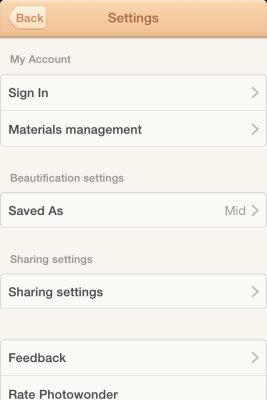 The home screen as shown above has five buttons namely edit, collage, filter camera, material, more beautiful. The little heart you see hanging at top right side of the screen will show you recommended apps by the developer. Whereas the circular wheel like icon at the bottom right corner is for managing the settings of the app. Settings option will let you sign into your account, manage the free materials provided by the app, modify share settings, and also allow the photos to be saved in 3 different resolutions. The settings window is shown in the screenshot below.