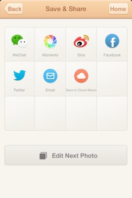 When you are done with all the editing, filters and frames then you can click the save and share button on top right hand side of the screen. This will save the edited photo in your phone’s photo gallery and also take you to the photo sharing page. The photo sharing page, shown in the screenshot below, has lot of sharing options like Facebook, Twitter, Wechat, Sina, Moments, email or you also have the option to save it to your cloud album.