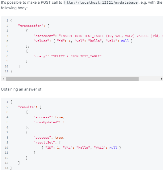 Now, when the server is running, you can open another command prompt and then start executing the SQL statements by making a simple API call. The JSON payload for POST request to execute SQL query or queries is below.