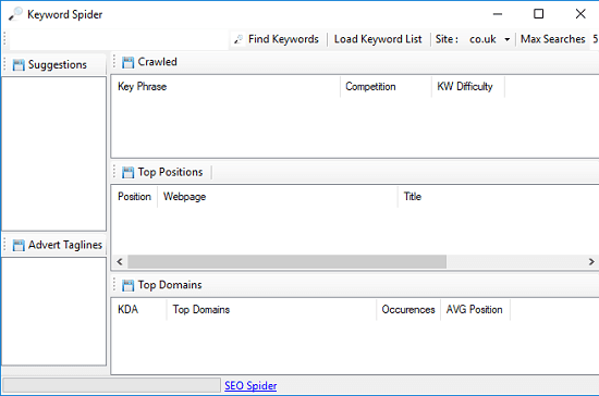 Keyword Spider is a free keyword search tool with advert taglines, competition, top domains, etc. It takes a main keyword from you and then you can see the related keywords with other data. It shows the advert taglines, top domains, top positions, and key phrases. You can see all this data in a few minutes after it processes all these for you by scraping it from Google. Also, you can see the details about the different key phrases that it finds related to the main input keyword. And all the data that it shows can be exported to a TXT file easily.